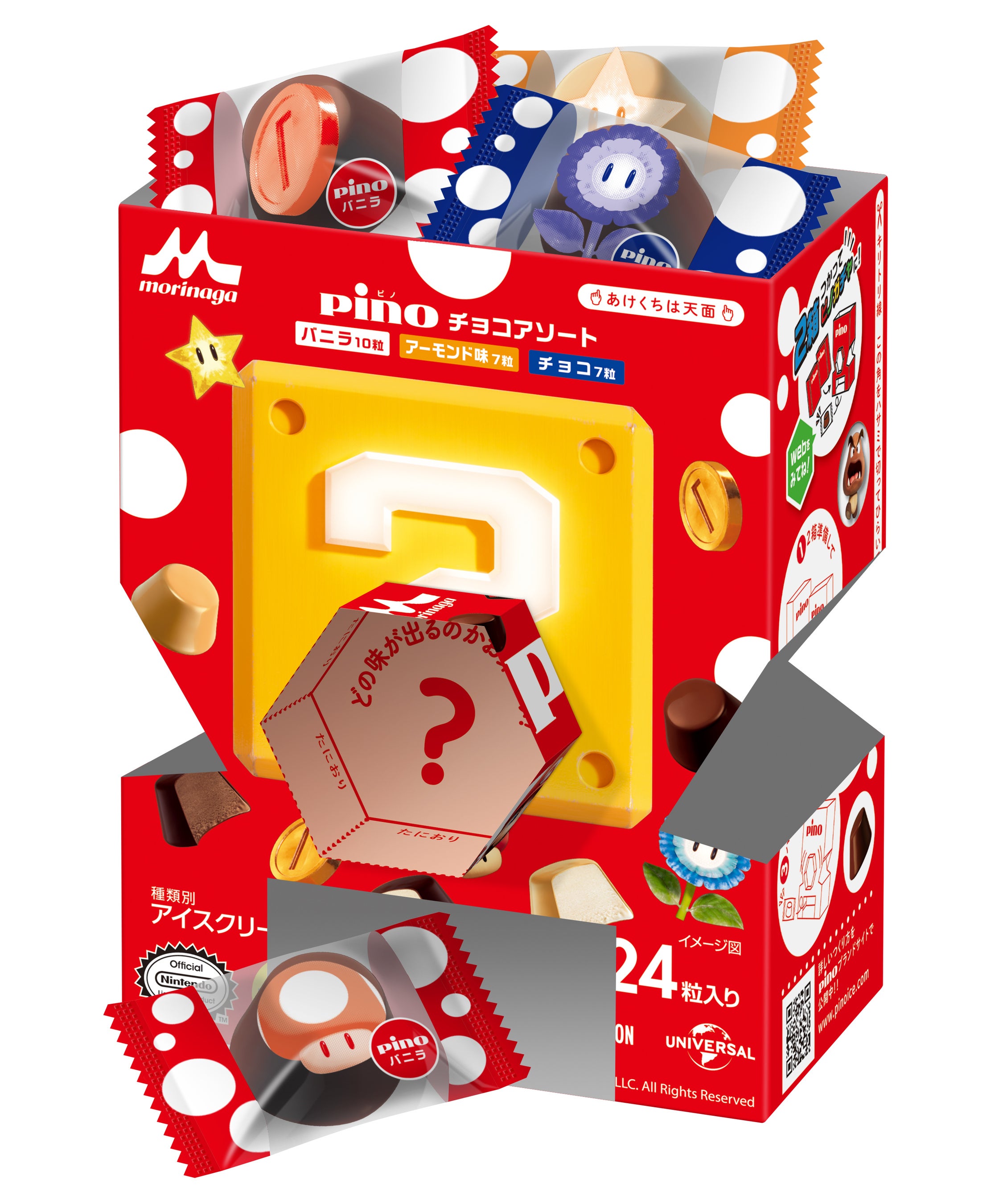 コラボパッケージでは、「ピノ」のフタ裏でオリジナルの遊びが楽しめるようになっています。さらに「ピノ チョコアソート」「ピノ シーズンアソート」は2箱使用すると「ピノガチャ」が作れる「ピノガチャ」パッケージになっています。パッケージの裏面がハテナブロック、個包装フィルムが映画内に出てくるアイテム(4種)のデザインになっているので、ガチャを回すことでマリオがハテナブロックからアイテムを登場させるような、ドキドキワクワクする気分を味わえます。