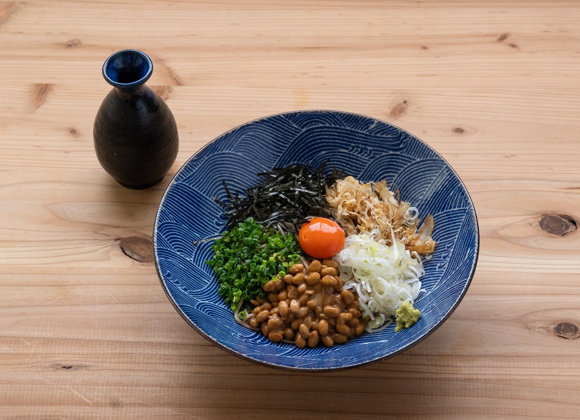 希少な国産有機大豆を使用し炭火の天然赤外線で発酵させたヤマキ醸造こだわりの納豆。濃厚な角谷卵を乗せ、しっかり混ぜてお召し上がりください。