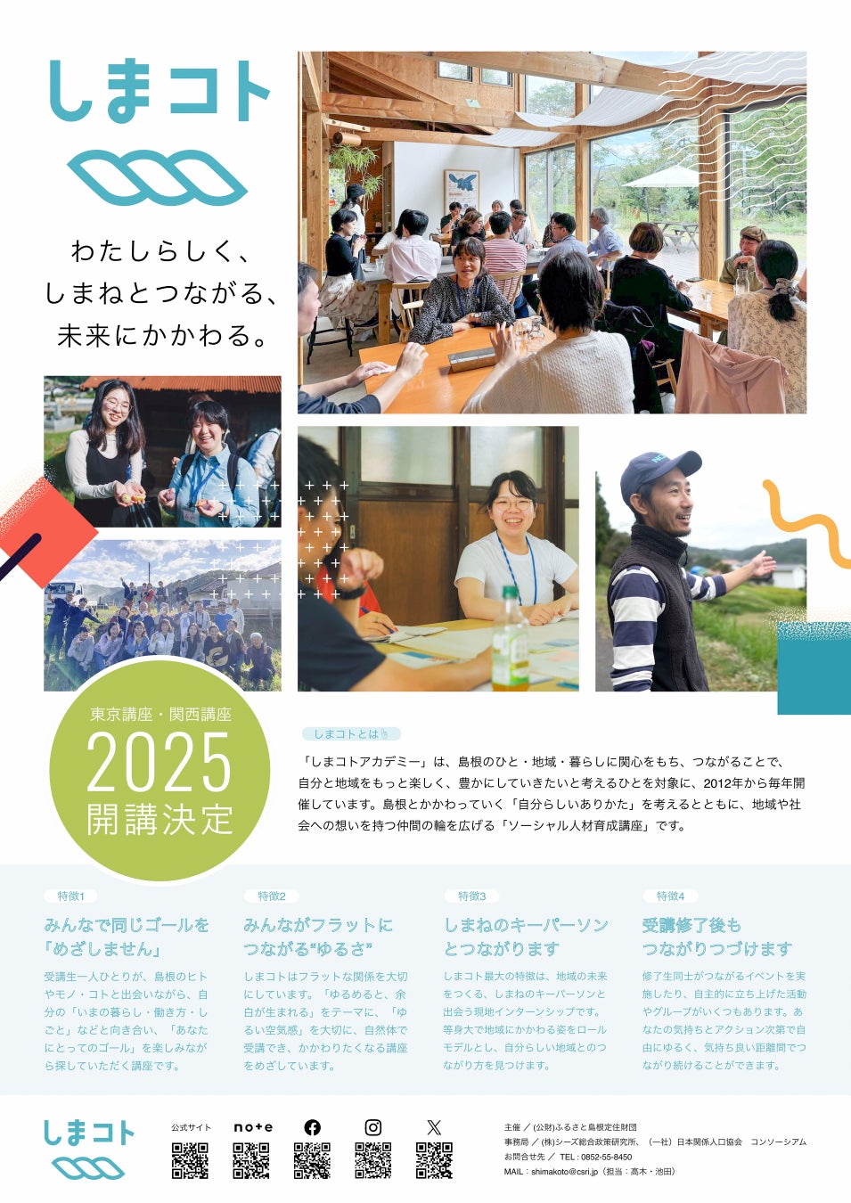 「しまコトアカデミー」は、島根のひと・地域・暮らしに関心をもち、つながることで、自分と地域を豊かにしていきたいと考える県内外の方を対象に2012年から毎年開催しています。令和7年度も開催が決定し、受講生募集を開始いたしました。