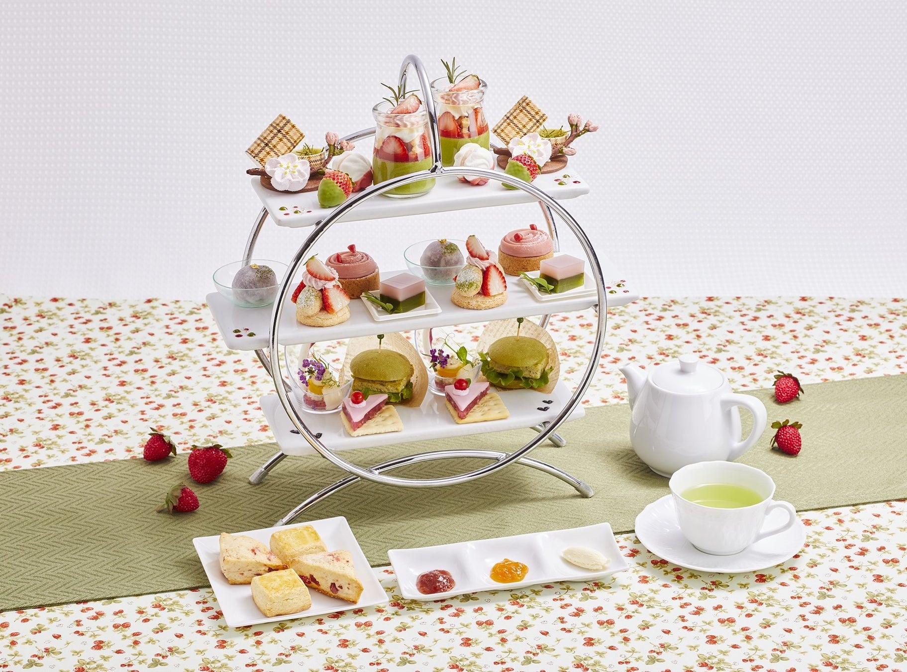 「フォンテーヌ」には、ピンクと緑の春色に彩られた「いちごと抹茶のアフタヌーンティー」が登場。春の訪れを感じさせる桜のモチーフを添え、お茶席を表現したチョコレート細工や、濃厚な抹茶のムースに、いちごの爽やかな酸味が相性抜群のグラスデザートなどをご用意いたしました。