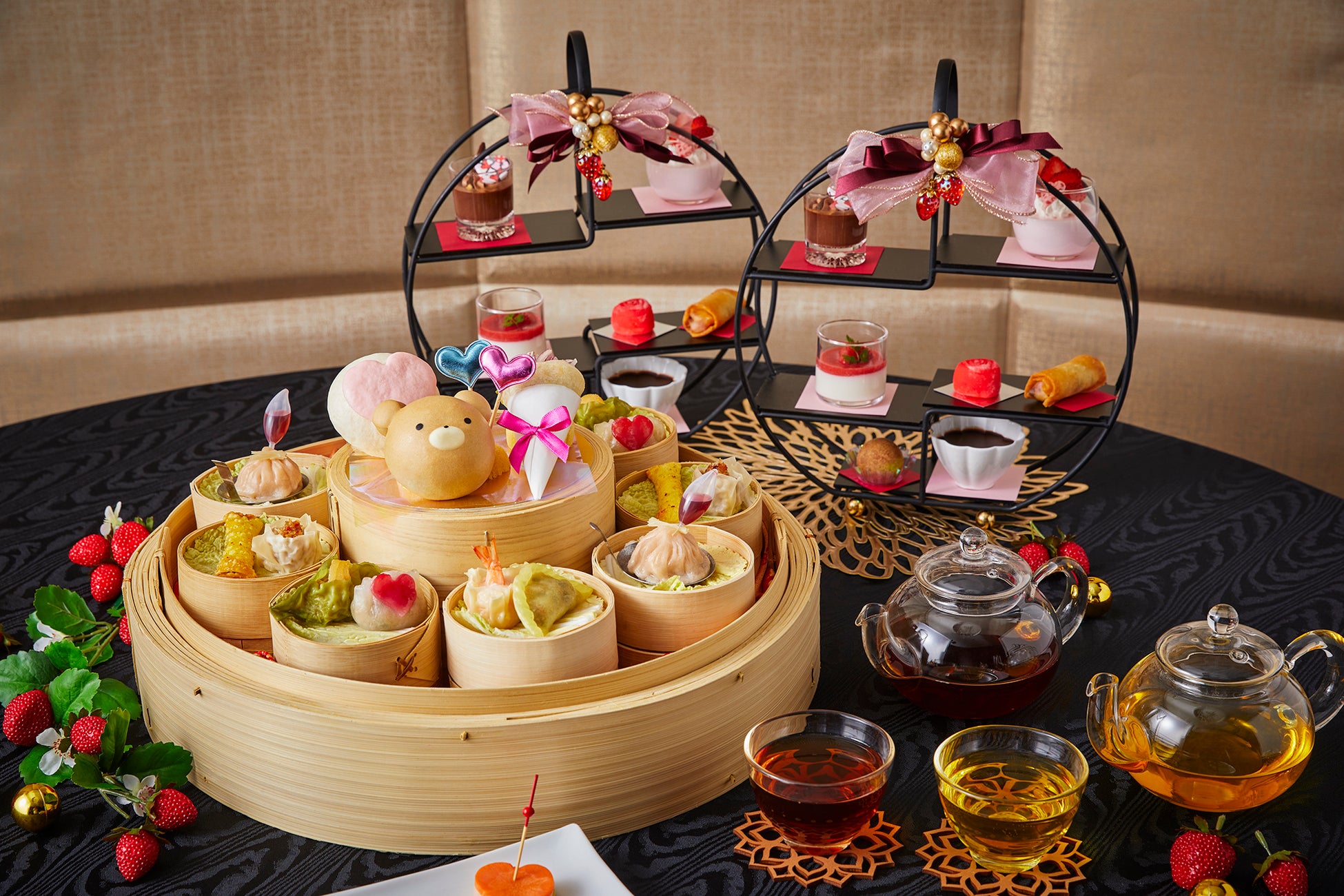 スタンドには、甘酸っぱいいちごのソースが爽やかな杏仁豆腐や、優しいピンク色のストロベリープリン、口当たりなめらかなチョコレートムースをご用意いたします。また、ハート型でバラの模様をあしらったストロベリー生月餅や、いちごとバナナ、チョコレートの甘みとパリパリ食感が楽しいハルマキ、ビターな味わいのタピオカ入りココアミルクなど、中国料理ならではのスイーツも揃います。甘酸っぱいいちごとコクの深いチョコレートとの絶妙な組合せを、香り豊かな中国茶とともにぜひご賞味ください。