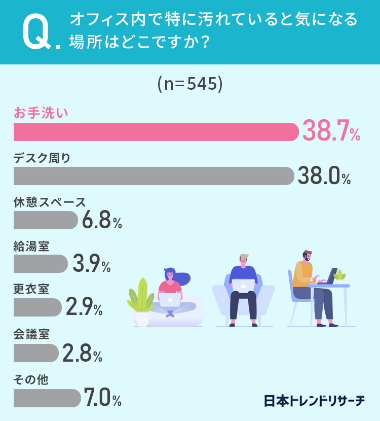 「デスク周り」「お手洗い」が38%前後という結果になりました。