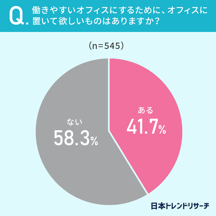 41.7%の方が、働きやすいオフィスにするためにオフィスに置いて欲しいものが「ある」と回答しています。