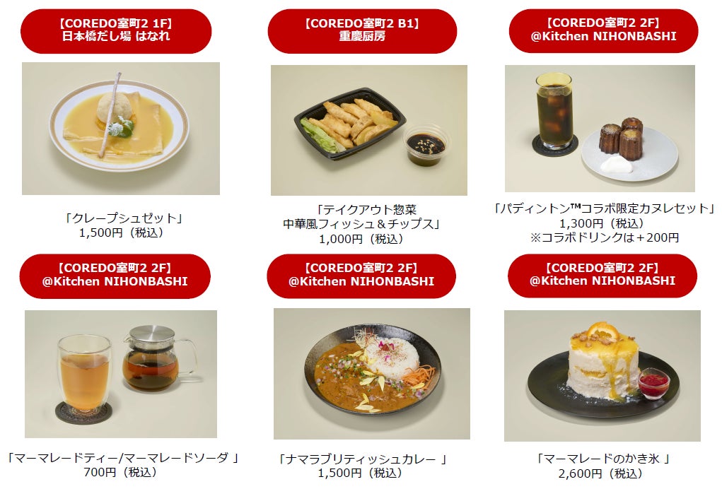 COREDO室町館内の飲食店舗でオリジナルメニューを期間限定販売。パディントン™が大好きなマーマレードやココア、イギリス料理等をテーマにした、オリジナルメニューをお楽しみください。さらに、オリジナルメニューをご注文の方に限定でノベルティをプレゼント。