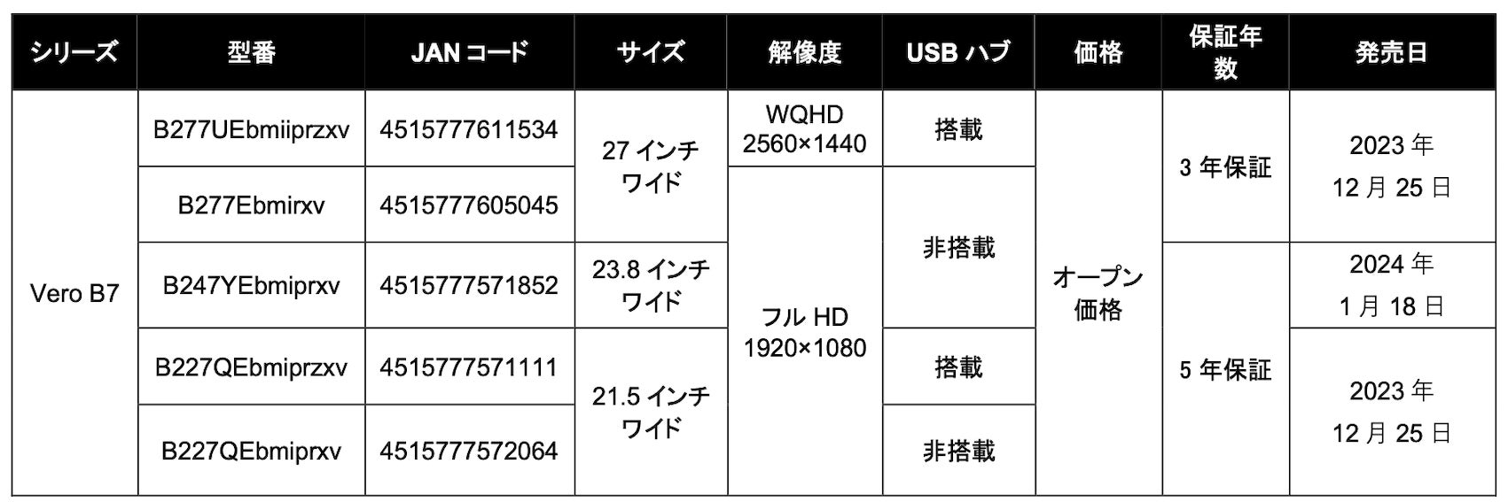 日本エイサー株式会社(本社:東京都新宿区、代表取締役社長:ボブ・セン)は、Acerの統合的なサステナビリティに考慮した取り組みを具現化するサステナブルな製品シリーズAcer Vero(ヴェロ)より、スタンダードモニターB7シリーズより安心の5年保証モデルを含めた、27インチモニター「B277UEbmiiprzxv」「B277Ebmirxv」、23.8インチモニター「B247YEbmiprxv」、21.5インチモニター「B227QEbmiprzxv」「B227QEbmiprxv」を本日2023年12月25日(月)より順次発売します。