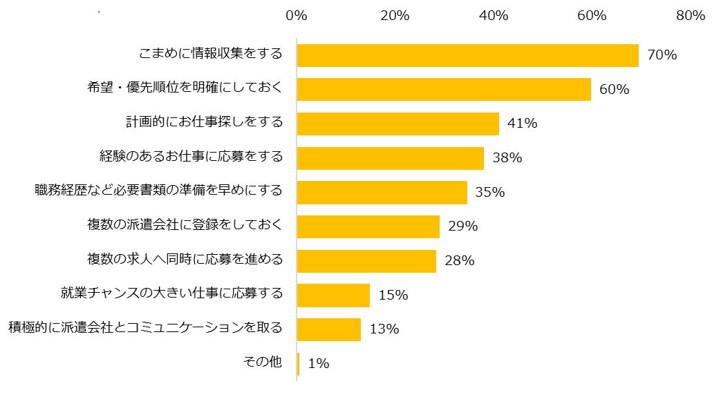 続いて、希望する時期に派遣で働き始めるために効果的だと思うことを伺いました。トップは「こまめに情報収集をする」(70%)、次いで「希望・優先順位を明確にしておく」(60%)が続きました。