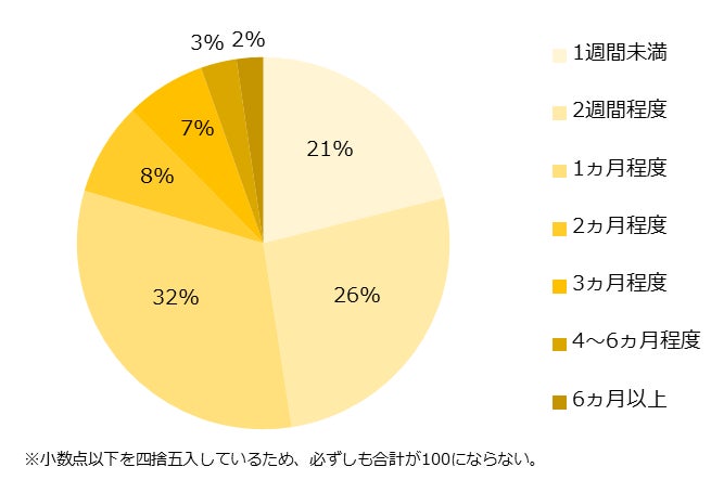 仕事を探し始めてから就業が決定するまでにかかる時間の想定について伺うと、「1ヵ月程度」が最多で32%。1ヵ月未満で考えている方が約8割を占めました(1週間未満:21%、2週間程度:26%、1ヵ月程度:32%)。
