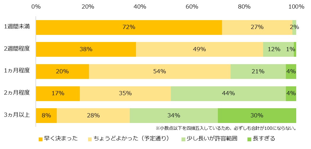 続いて、仕事を探し始めてから、現在のお仕事に就くまでにかかった時間についての感想を伺いました。「早く決まった」「ちょうどよかった(予定通り)」と感じた方は、就業までの期間が「1週間未満」で99%、「2週間程度」で87%、「1ヵ月程度」で74%、「2カ月程度」で52%となり、「3ヵ月以上」は36%となりました。