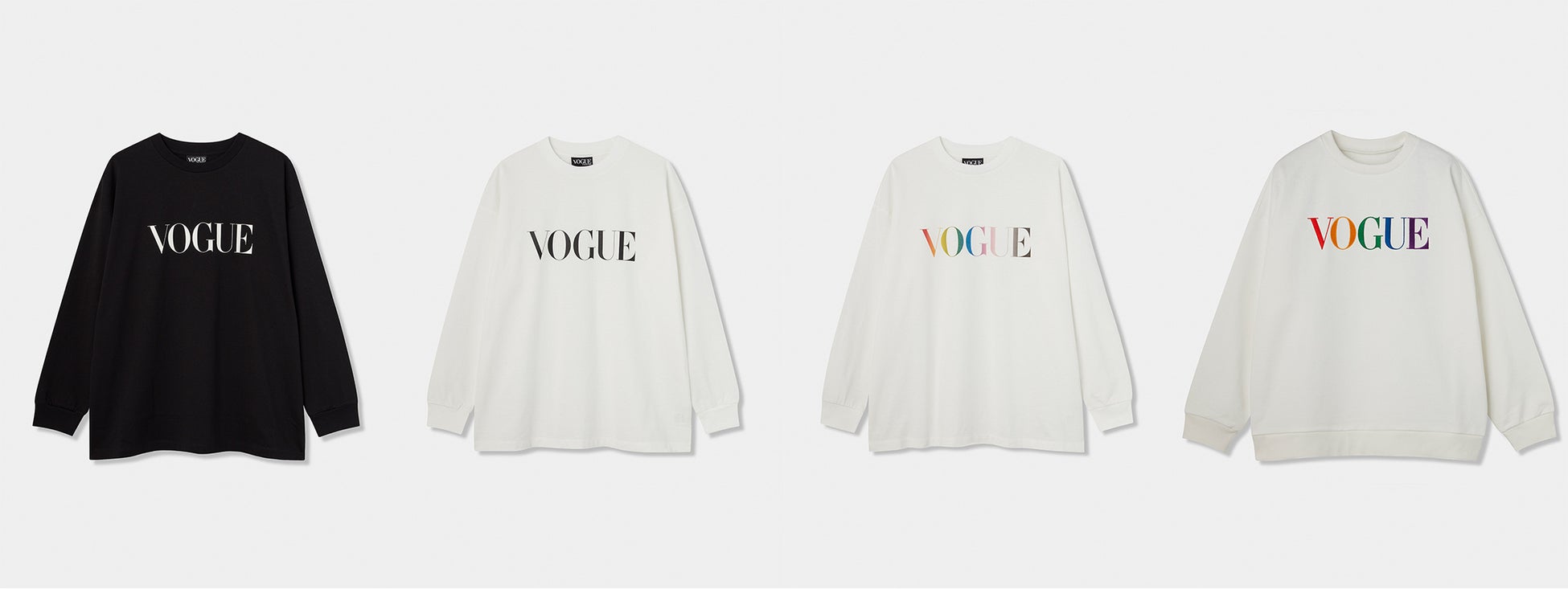 (左より3型)11月25日販売開始『VOGUE』ロゴ ロングTシャツ(各種¥13,800(税込・送料込)、S /M/L/XL)
