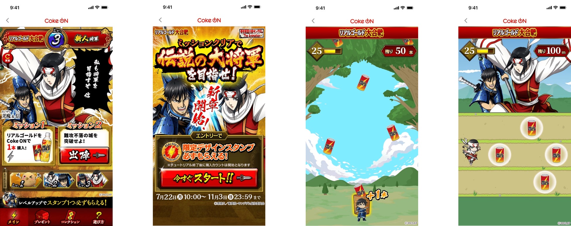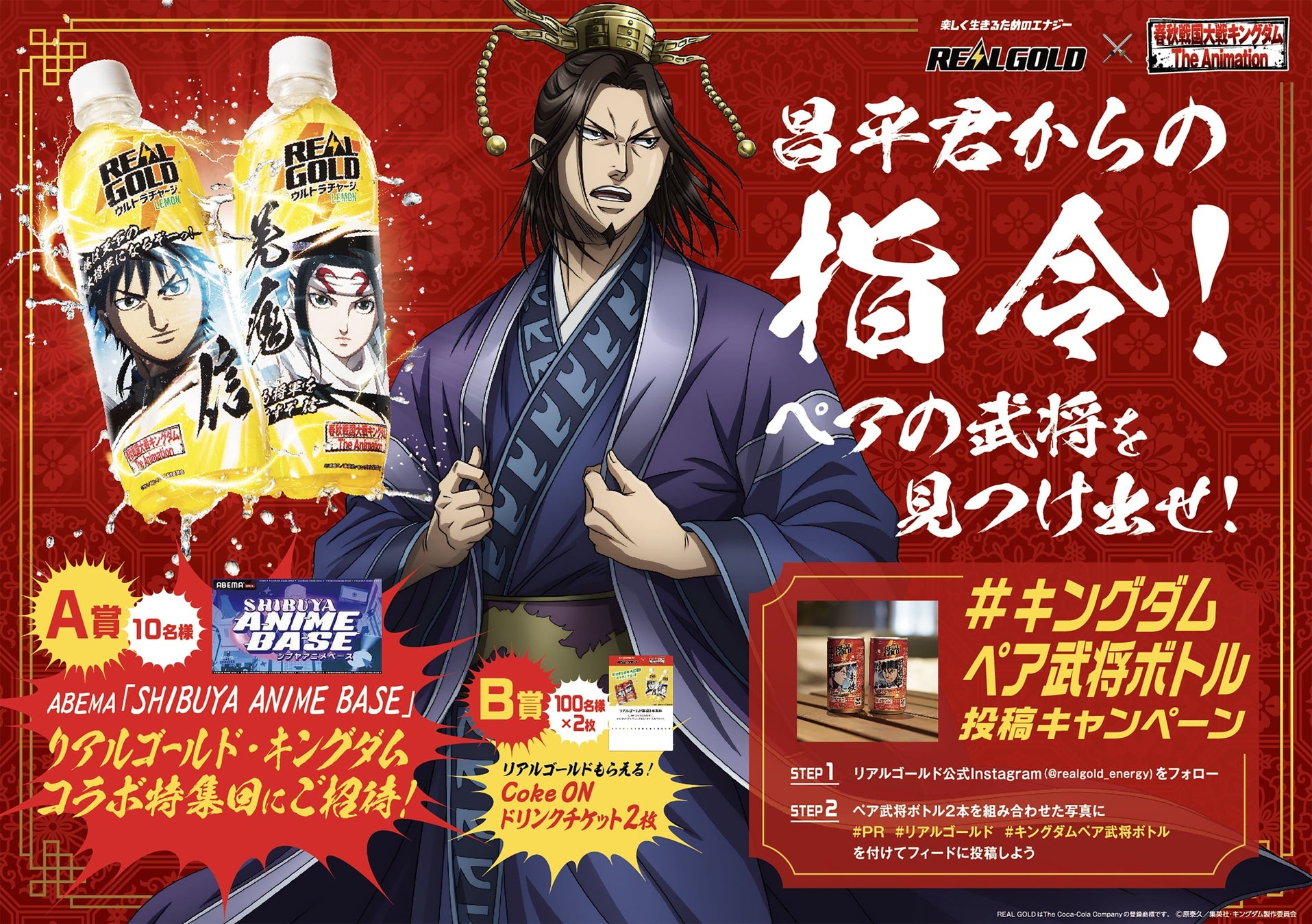 「リアルゴールド」公式Instagramをフォローし、“ペア武将ボトル”2本の写真を指定のハッシュタグと共に投稿すると、抽選で100名様に「リアルゴールド」製品1本と引き換えできる「Coke ONドリンクチケット」2枚をプレゼントするほか、抽選で10名様をABEMA番組「SHIBUYA ANIME BASE」#シブアニでの「リアルゴールド」・『キングダム』コラボ特集回収録現場での観覧にご招待します。詳細は「リアルゴールド」公式Instagramでの投稿にご注目ください。