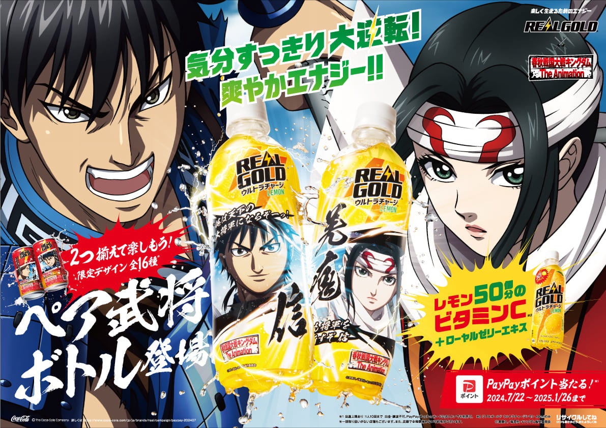 コカ・コーラシステムは、楽しく生きるためのエナジードリンクブランド「リアルゴールド」から、TVアニメ『キングダム』とコラボレーションした限定パッケージ全16種類※1を、2024年7月22日(月)より全国で発売します。