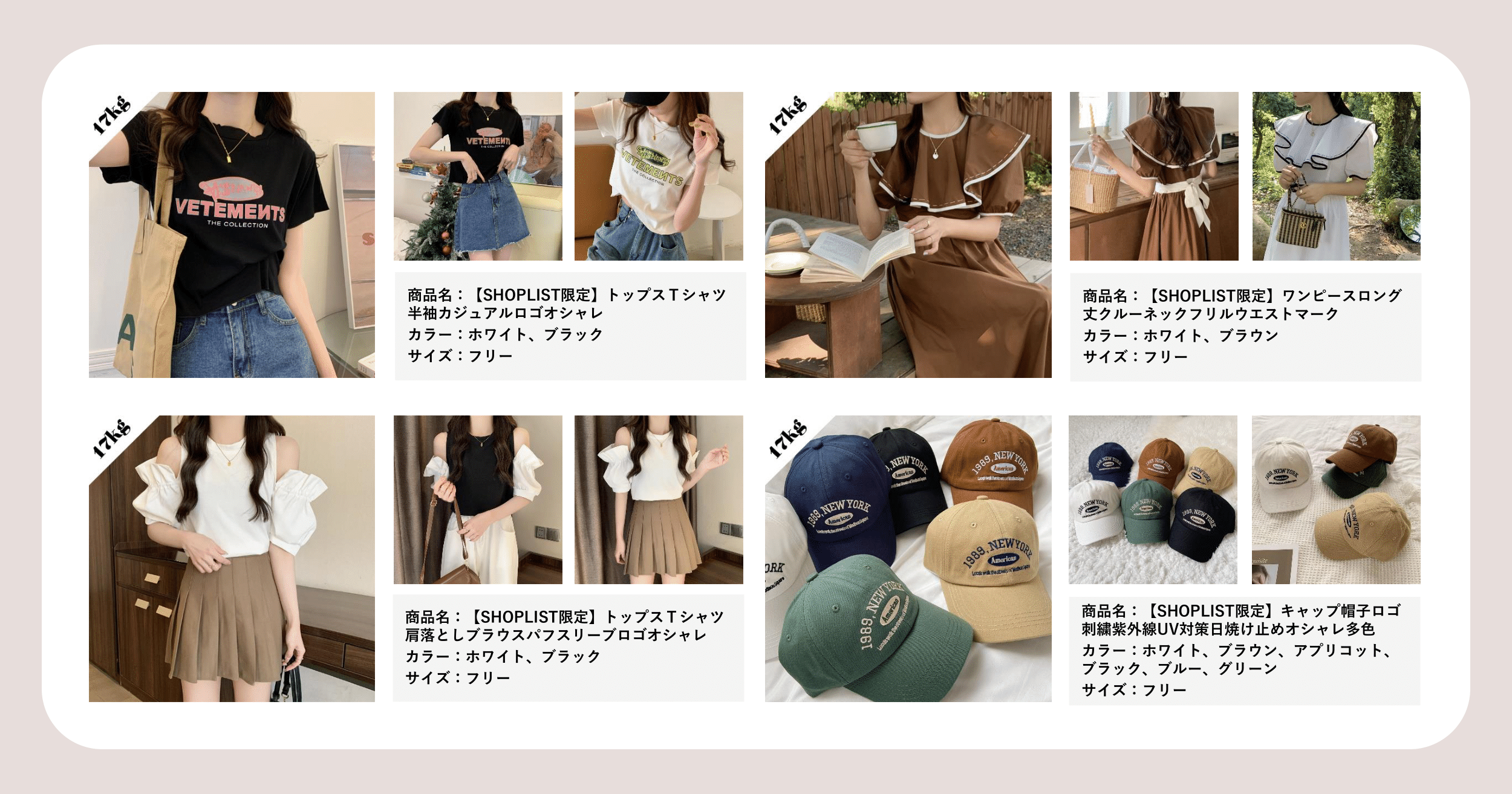 「17kg(イチナナキログラム)」は、プチプラ韓国レディースファッションブランドです。Instagramで48.5万人、LINE公式アカウントで20.8万人、Twitterで3.6万人とSNS合計総フォロワー数は72.9万人(2022年5月現在)と、10~20代女性に非常に人気を博しております。また、最新トレンドからベーシックまで豊富なアイテムを、お手頃な価格で販売しております。今回「17kg(イチナナキログラム)」がSHOPLISTに新規オープンすることで、人気の韓国ファッション商品の取り扱いを拡大し、品揃えが今まで以上に充実いたしました。これにより、既存ユーザーの満足度向上と新規ユーザー獲得を目指していきます。