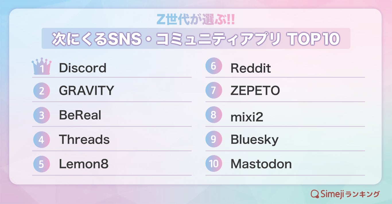 【Simejiランキング】Z世代が選ぶ!!「次にくるSNS・コミュニティアプリ TOP10」
