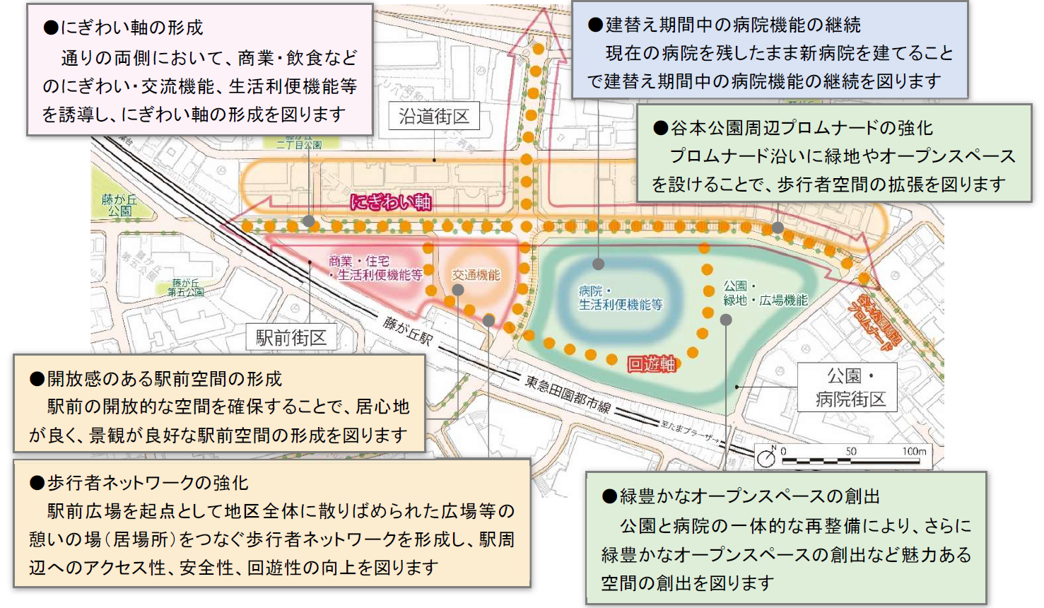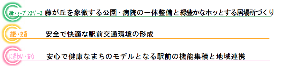 目 標:オープンスペース、病院、駅前の商業等が連携した、藤が丘らしい駅前拠点の形成