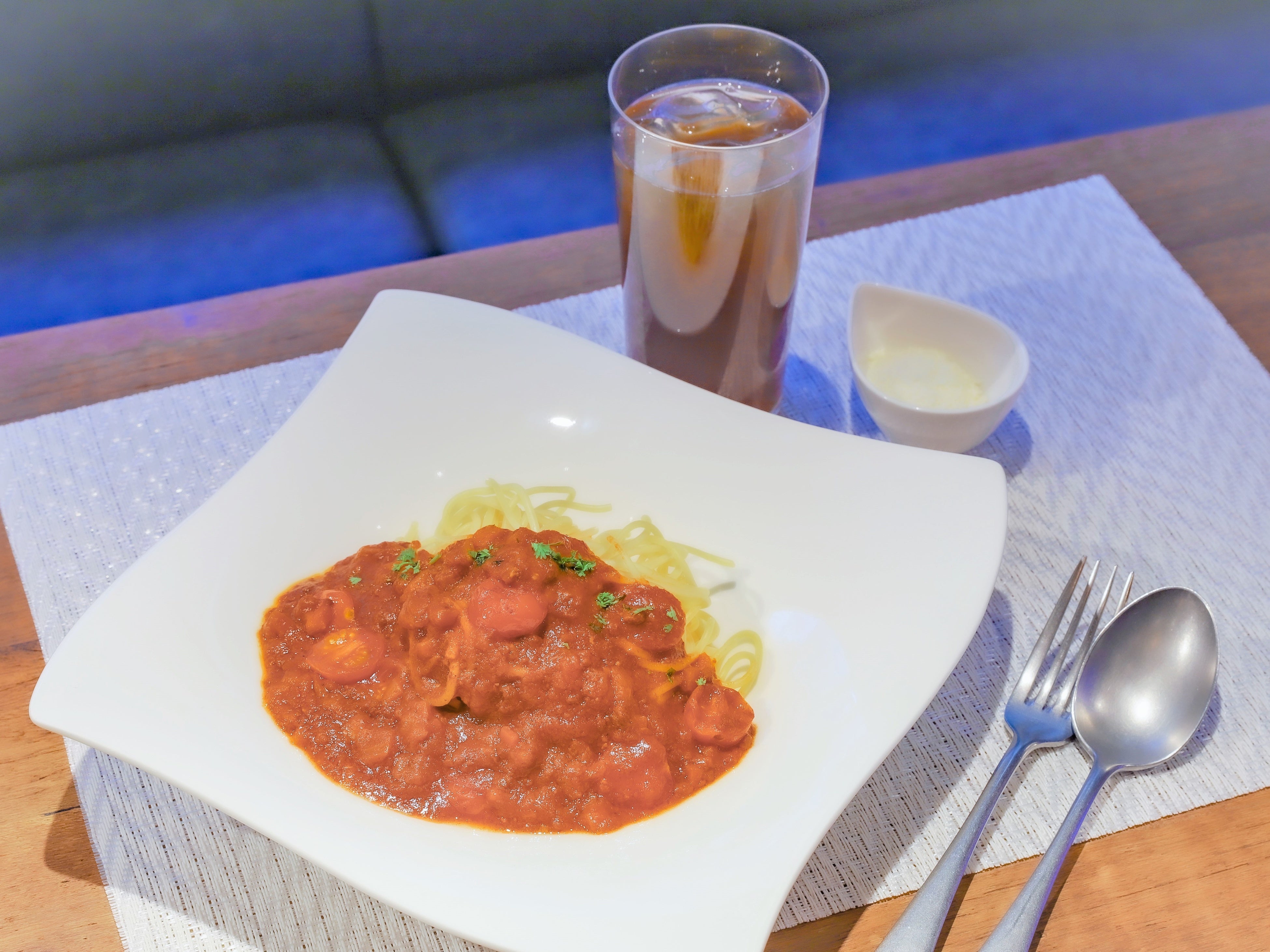 がっつり食べたいときにもピッタリなスパゲッティです。スプーンを使って余すことなくミートソースを楽しんで。