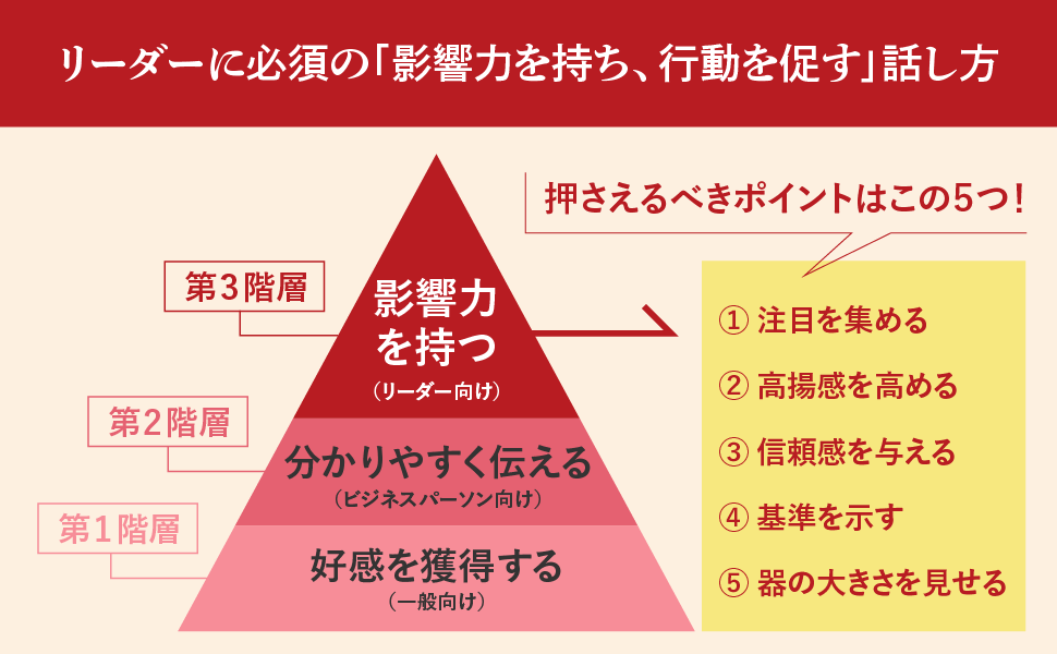 そのあとに続く最終段階が、第3階層の「影響力」です。これは言葉の力で大衆を導く段階で、リーダーのためのスキルです。自分を支持する人たち、従う人たちを増やし、周りを巻き込む段階です。しかも、彼らが嫌々そうするのではなく、自らよろこんで従うことが理想です。意図する方向に集団を率いるための話し方です。