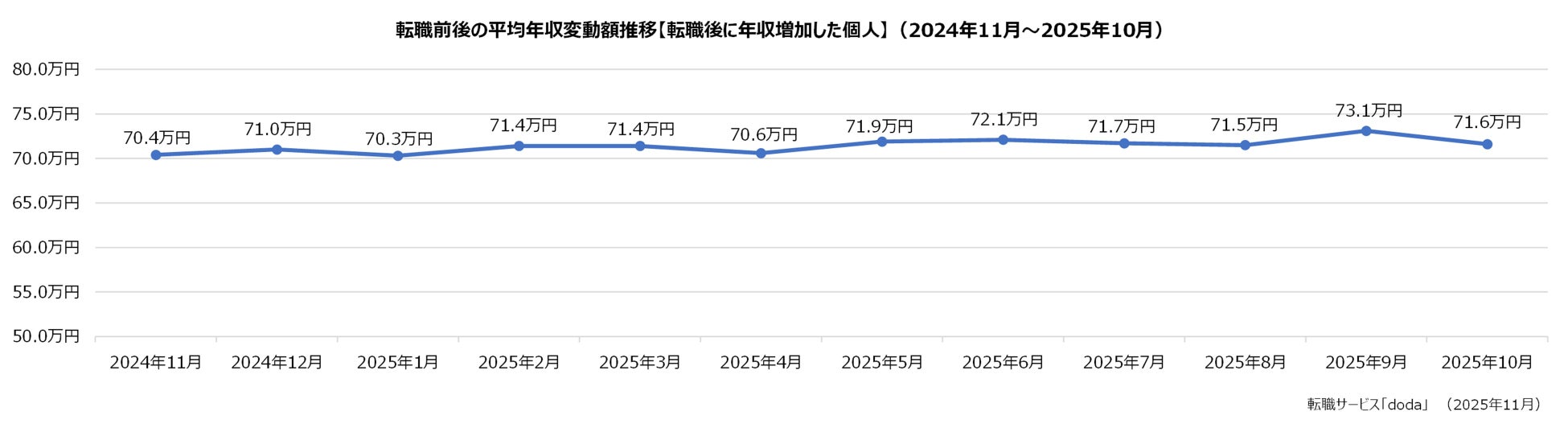 転職前後の平均年収変動額【転職後に年収増加した個人】:+71.6万円(前月差:-1.5万円)