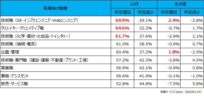 転職後に年収増加した個人が多かった職種は、「技術職(SE・インフラエンジニア・Webエンジニア)」(69.9%)、次いで「クリエイター・クリエイティブ職」(64.6%)、そして「技術職(化学・素材・化粧品・トイレタリー)」(61.7%)が続きました。