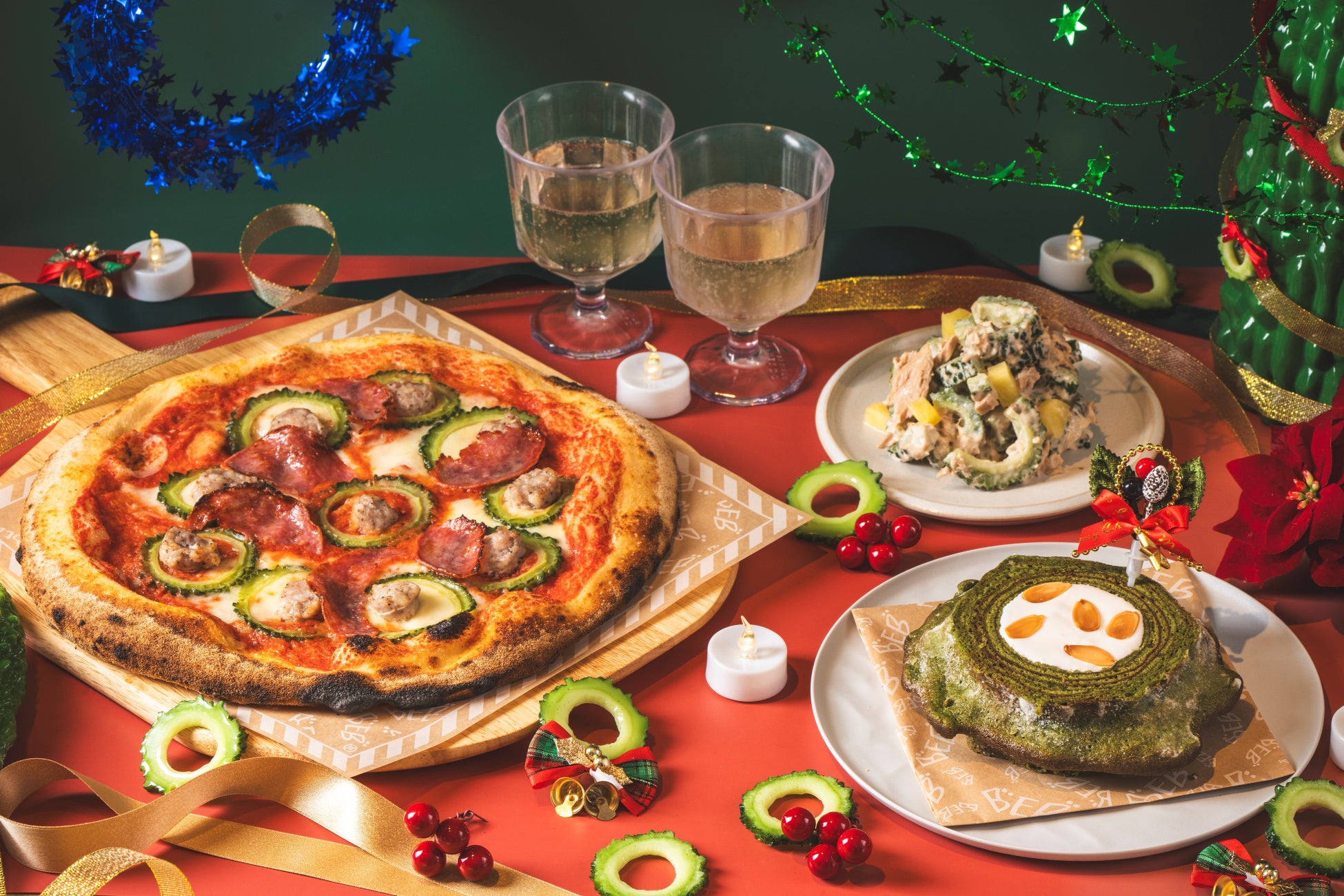 内容:ピッツァ「ゴーヤーサルシッチャ」、ゴーヤーとパイナップルのサラダ、ゴーヤークリスマスケーキ、沖縄のクラフトビール「GOYA DRY」