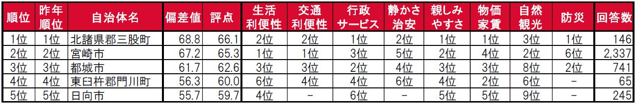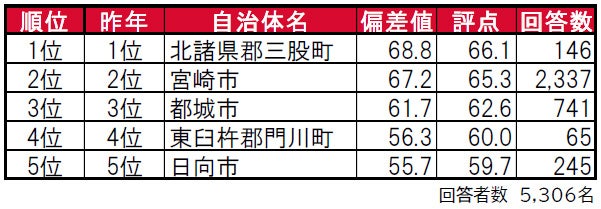 住みここちは4年連続で、1位北諸県郡三股町、2位宮崎市。3位は2年連続で都城市。