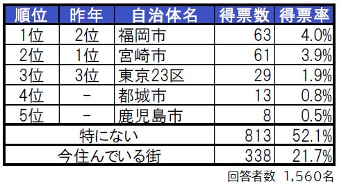 住みたい街は、1位福岡市、2位宮崎市。3位は2年連続で東京23区。