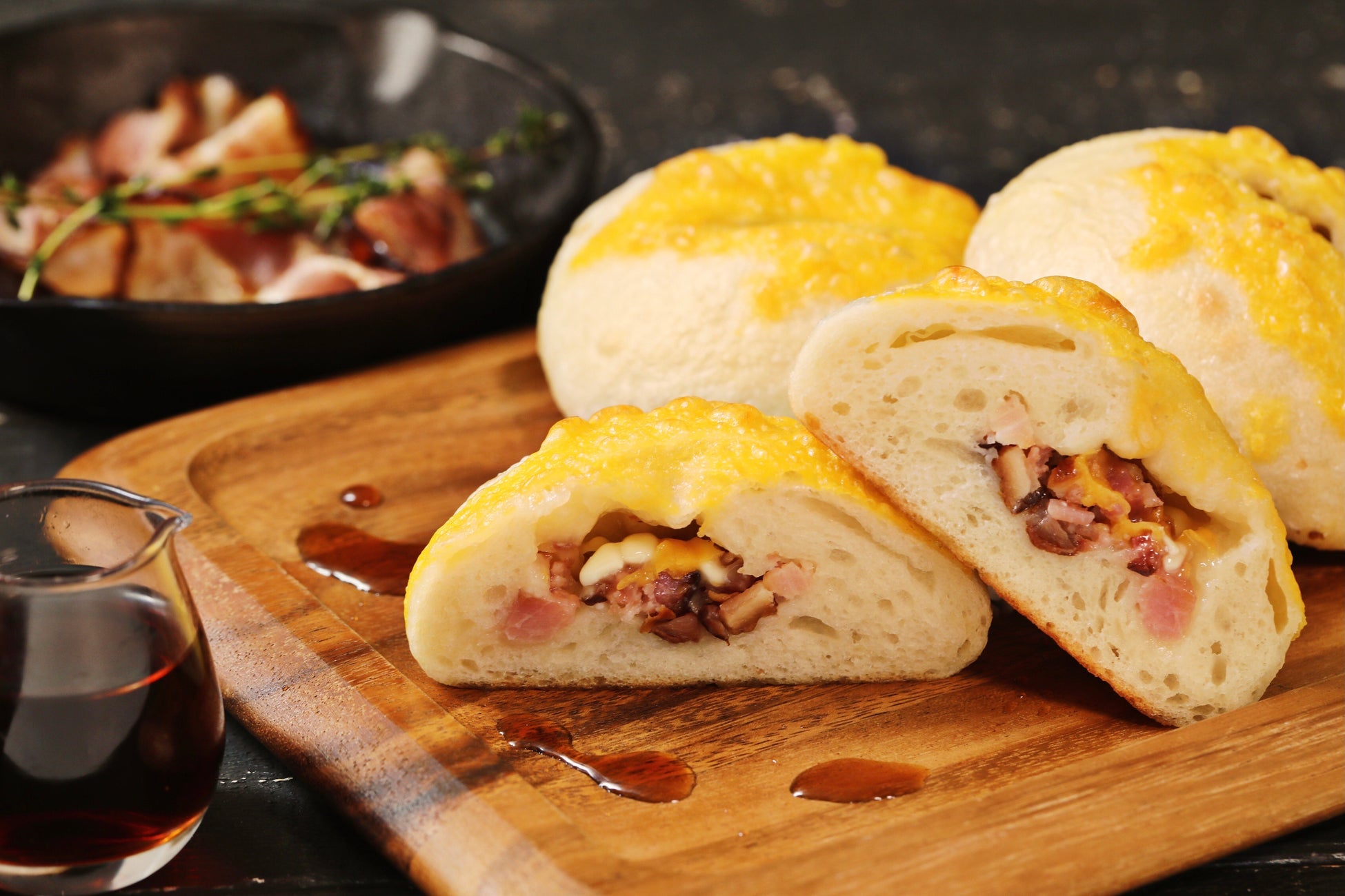 こだわり:燻製ベーコンとメイプルバターの風味を味わえる、丸い形