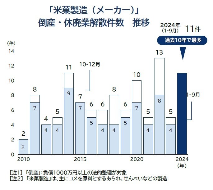 全国的なコメ不足と価格高騰の影響が、せんべいなどコメを原料とする菓子にも及んできた。コメを原料にせんべいやあられ、おかきなどを製造する米菓製造業の倒産(負債1000万円以上、法的整理)や休廃業解散は9月までに計11件発生した。2023年通年の件数(5件)を上回る増加ペースで、過去最多となる可能性がある。