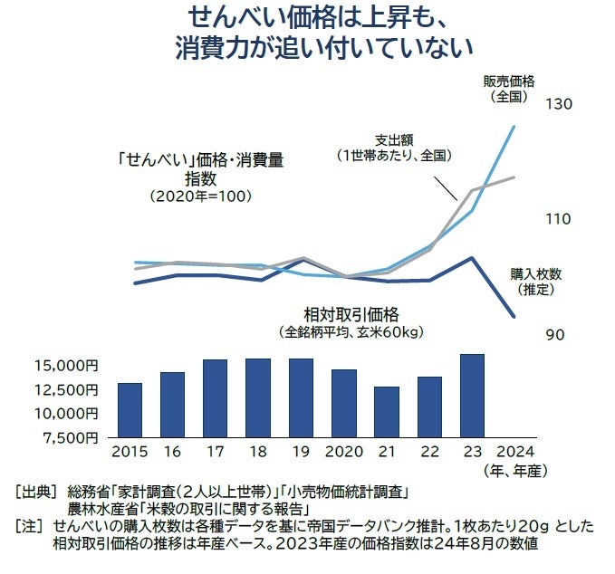 米菓メーカーでは、米菓需要の低迷と原料となる国産米の価格高騰によるコストアップの狭間で厳しい経営環境が続いている。総務省の調査によれば、せんべい(100g)の小売価格は2024年平均で149円・2020年比で2割超上昇し過去10年で最高値を記録した。大手米菓メーカーを中心に、製造コストの上昇による値上げの実施が影響した。一方で、せんべいへの家計支出は2020年比17%増にとどまり、購入枚数も推計で家計当たり月2枚分(同7%)減少した。近年はお中元・お歳暮などの需要減が続いたことに加え、家計の節約志向で買い控えや他ジャンルの菓子への需要が流出するといった影響も大きかったとみられる。足元では原料となる国産米の価格高騰に加え、安価な米国産など輸入米も円安で価格が上昇、生産現場における人手不足も重なって製造コストの上昇が続いており、「値上げしなければ経営が成り立たない」状況が続いている。