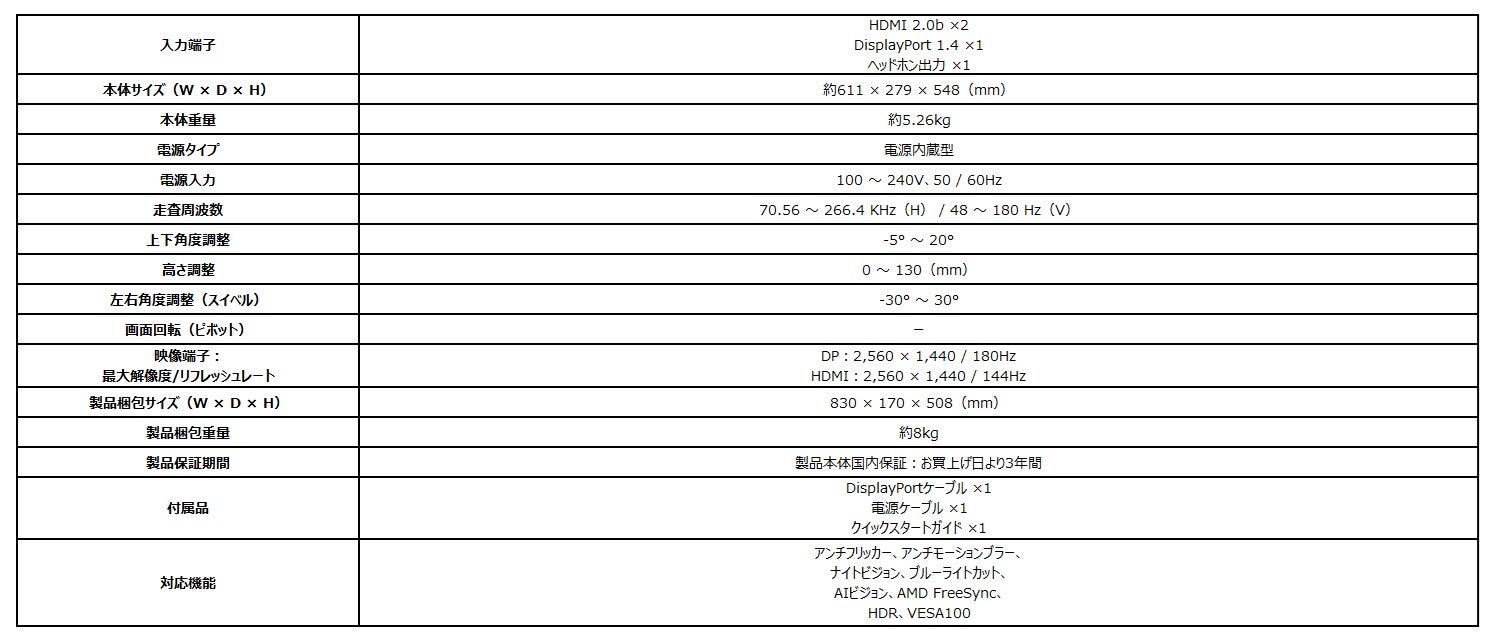 「MAG 27CQ6PF」は人間の視野に近い湾曲率で高い没入感が得られる湾曲パネル、近年人気が高まっている27インチサイズ、フルHDの約1.8倍高精細なWQHD解像度、高コントラストと高速応答を両立したRAPID VAパネルを搭載し、高精細で奥行きのある映像を楽しめる湾曲ゲーミングモニターです。リフレッシュレート180Hz、応答速度0.5ms(GTG、最小値)の高いゲーミング性能と、黒挿入機能であるアンチモーションブラーにより競技性の高いゲームタイトルが快適にプレイできます。映像シーンに合わせて画面の明るさ・コントラスト・彩度を自動で調整するAIビジョン、リアルな映像表現が可能なHDR、ベストポジションで使用できる高性能スタンド、AMD FreeSyncに対応し、ストレスフリーでゲームプレイを楽しむことができます。また、モニターアームなどに取り付け可能なVESA規格にも対応しています。