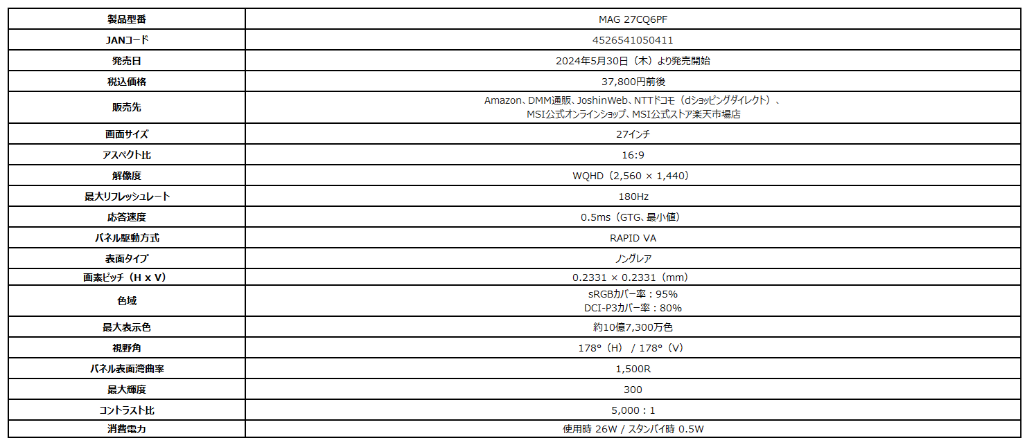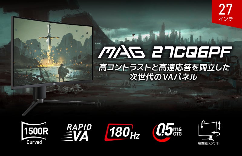 人気の27インチ・WQHDで高精細な映像を求めるゲーマーに最適湾曲率1,500R・180Hz・0.5ms(GTG)・高性能スタンド搭載「MAG 27CQ6PF」発売