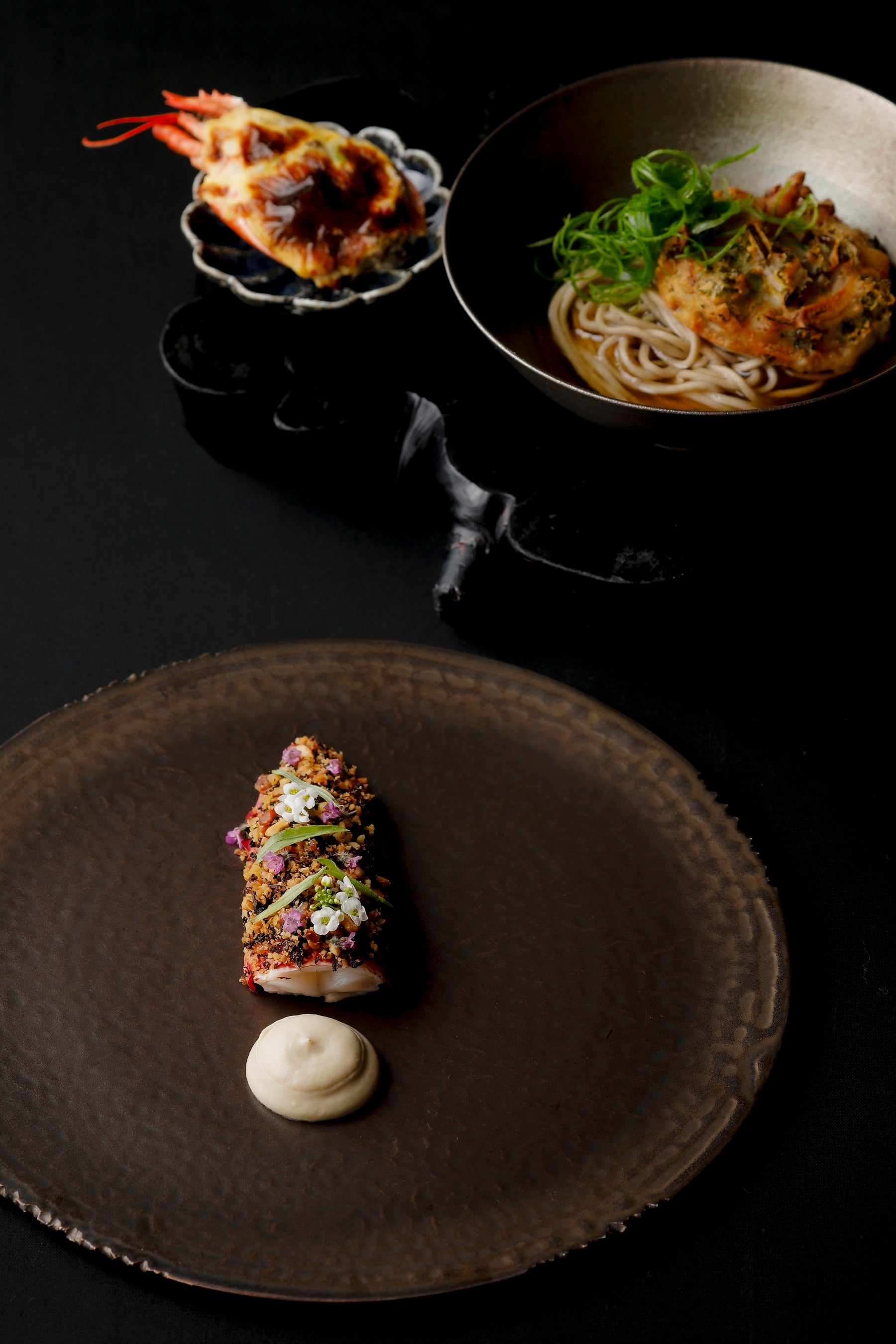 「ロワール産ホワイトアスパラガス 桜鯛 燻製」は、グリルしたロワール産ホワイトアスパラガスを杉板の上で燻製し、卵黄と澄ましバターベースの伝統的なベアルネーズソースや燻製鯛、フィンガーライム、花のピクルスなどの風味や味をからめながらお召し上がりいただきます。オマール海老を3種のメニューで仕立てた「オマール海老 ~3種の表現~」は、オマール海老の身を優しく火入れをし、味噌、ノワゼット、編笠茸を纏わせました。繊細な身は『ボンヌ・ファム』というフランス古典料理でご提供いたします。締めには殻から取った出汁で味わう海老蕎麦を。オマール海老を余すことなく使用し、自然の恵みに感謝しながら五感で味わう、この時期だけのメニューをお愉しみください。