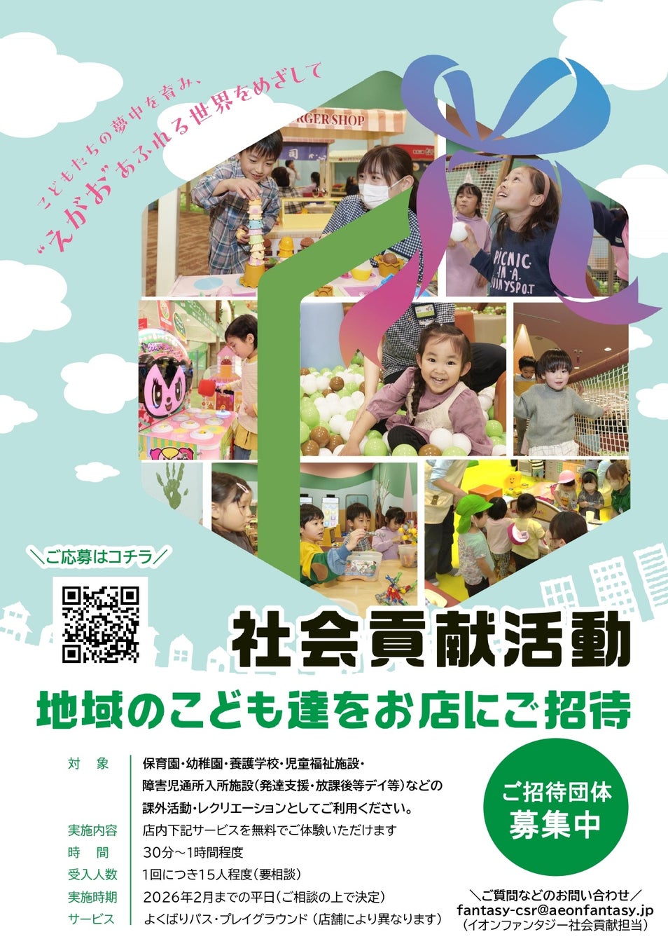 株式会社イオンファンタジー(本社:千葉市美浜区 代表取締役社長:藤原徳也 以下、当社)は、地域の子どもたちにえがおで遊んでいただくための社会貢献活動「お店への招待会」を全国で実施しております。この招待会をさらに拡大するため、2025年6月10日(火)より、全国の社会福祉施設・幼稚園等を対象に、招待会の一斉公募を開始いたします。
