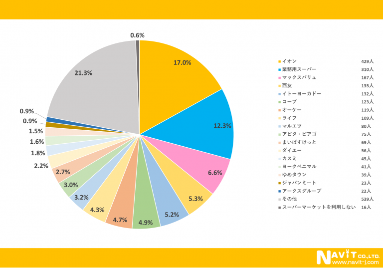 しかし、割合でいうと「その他」の21.3%が最多になるので、地域特有のスーパーマーケットを利用される方が多いということもわかりました。