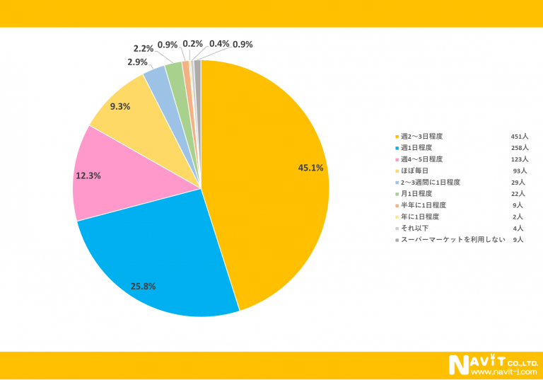 スーパーマーケットを利用する頻度については、「週2~3日程度」が45.1%、「週1日程度」が25.8%、「週4~5日程度」が12.3%という順になりました。