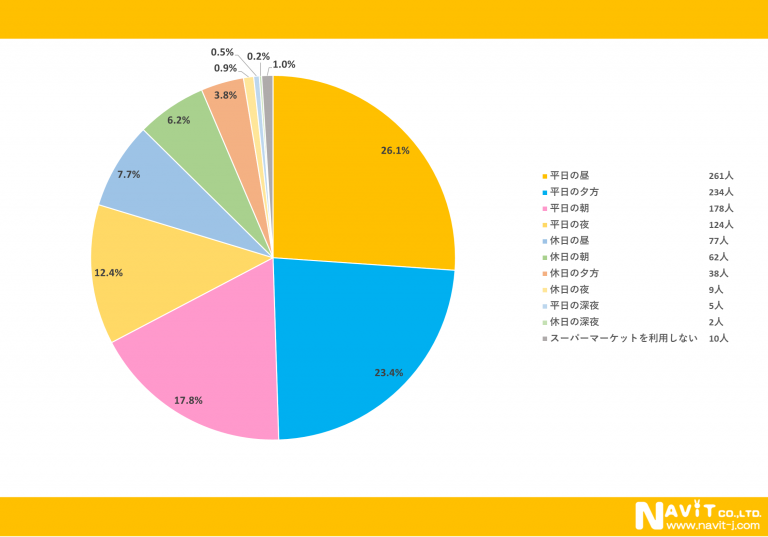 スーパーマーケットに行く時間帯については、「平日の昼」が26.1%、「平日の夕方」が23.4%、「平日の朝」が17.8%という順になりました。平日に利用されている方が多いようですね。