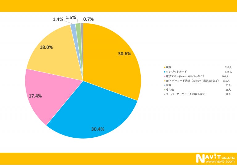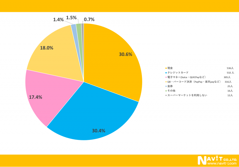 スーパーマーケットでの支払い方法については、「現金」が30.6%、「クレジットカード」が30.4%と、上位2つがほぼ同等の結果になりました。