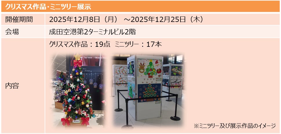 また、成田空港周辺の幼稚園・保育園等の子供たちが作成したクリスマス作品とミニツリーを成田空 港内に展示します。ぜひ空港にお越しいただき、お子様方の心温まる作品をご覧ください。