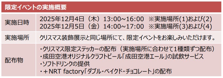 さらに、クリスマス限定のステッカー配布や、成田空港オリジナルクラフトビール「成田空港エール」、+NRT factory(※)の「ダブル・ベイクド・チョコレート」を無料でお楽しみいただける特別イベントも開催予定です。 この冬は、ぜひ成田空港にお越しいただき、心温まるクリスマスのひとときをお過ごしください。