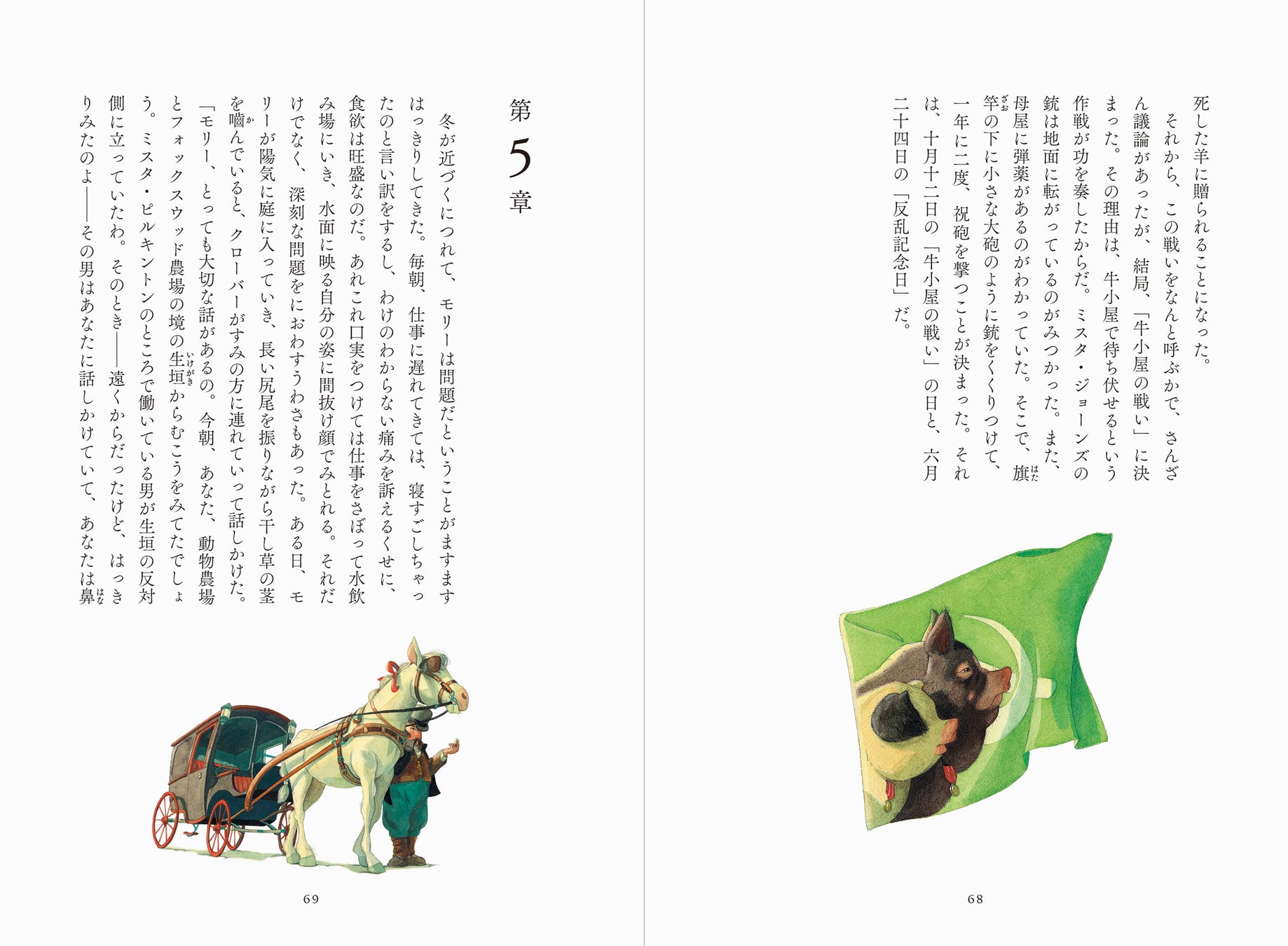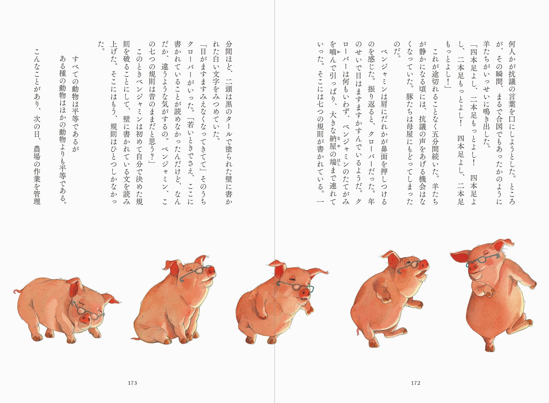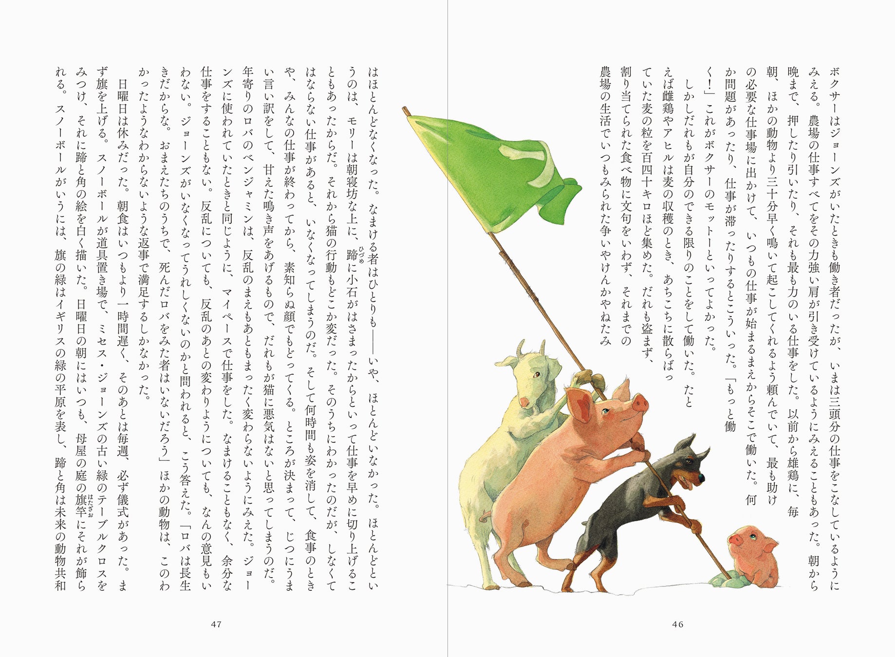 「わたしやほかの仲間が夢みて必死に頑張ったのは、こんな世界のためじゃない。」人間にしいたげられてきた動物たちが、自由と平等という理想をかかげ、運命に立ち向かうが……。人間はどれだけ非道で残酷になり得るか? そしてまた、歴史は繰り返すのか? ソビエト連邦の歴史をモデルに、ジョージ・オーウェルが皮肉をこめて見事に描いた動物物語。金原瑞人による巧みな訳文と、美しい挿画でおくる新訳決定版です!