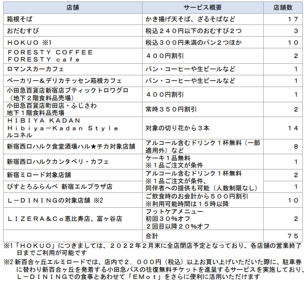 小田急電鉄株式会社(本社:東京都新宿区 社長:星野 晃司)は、MaaSアプリ「EMot」で販売している飲食・物販のサブスクリプションチケット「EMotパスポート」に、2022年1月12日(水)から3月31日(木)までの期間限定で新宿・新百合ヶ丘エリアを中心に24店舗追加し、対象メニューを拡充します。料金は月額9,500円(税込)に据え置き、これまでの個人での日常生活から、ご家族や友人との食事をお得にシェアして楽しんだり、自分へのご褒美にもさらに活用シーンが広がります。