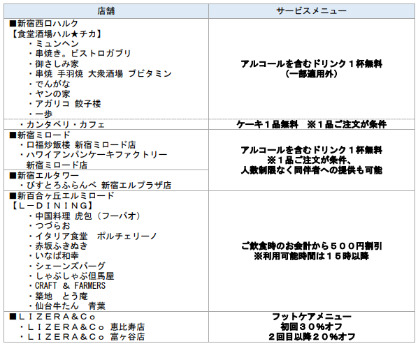 さらに、自分へのご褒美のメニューとして、「LIZERA&Co(リゼラ&コー)」恵比寿店と富ヶ谷店ではフットケアメニューの初回ご利用時に定価(シンプルケア7,700円など)から30%オフするほか、これまで季節のイベントにあわせて期間限定のサービス提供をしてきた小田急百貨店町田店・ふじさわの食料品売場では、常時割引サービスを提供します。