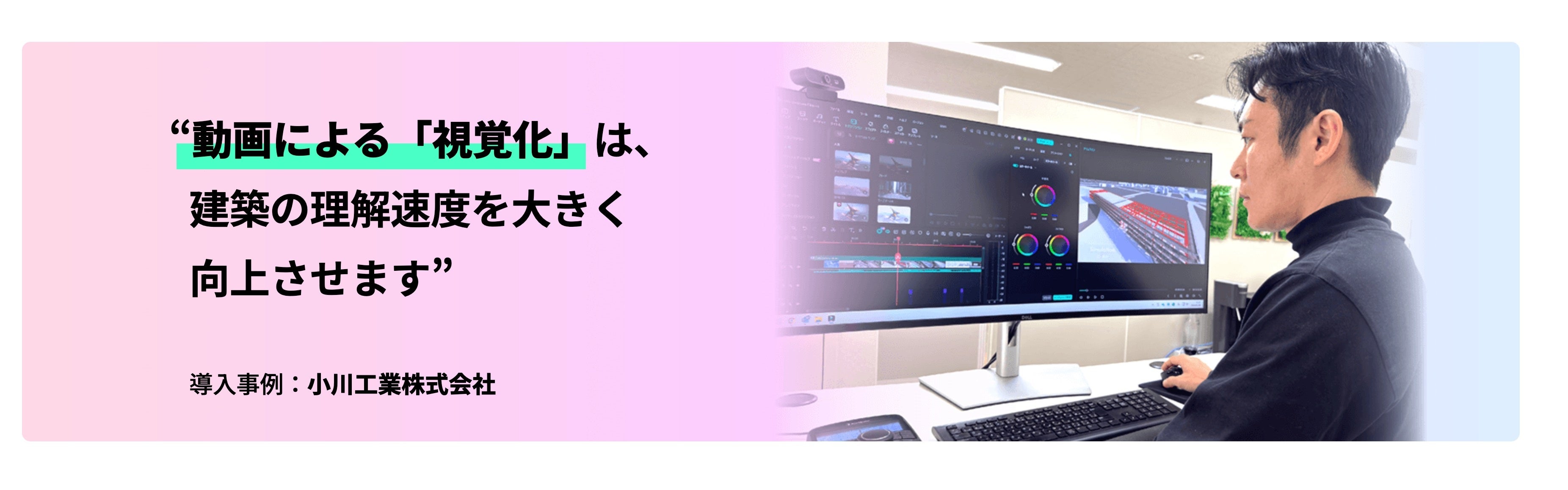 導入後は、動画による視覚的なプレゼンテーションが可能になったことで、施主の理解度が向上。短時間で高品質な動画を内製できるため、迅速な合意形成と担当者の業務負担軽減を両立させています。