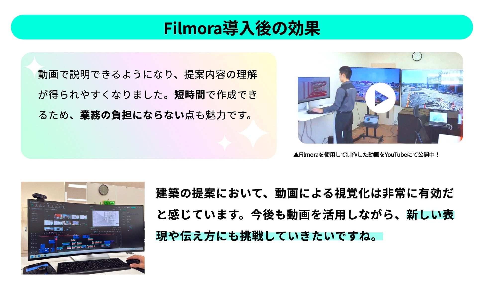 総合建設会社の小川工業が、動画編集ソフト『Filmora』を活用。建設提案の「視覚化」を実現。