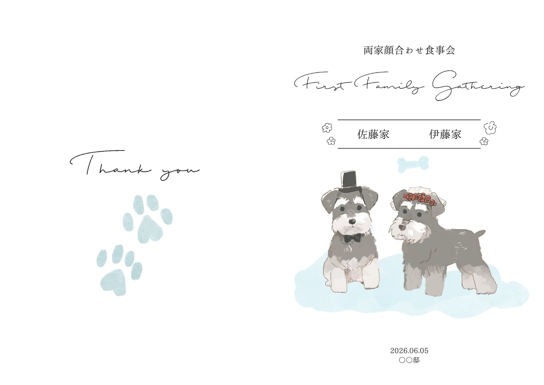 ふわふわの眉毛に、キリッとしたひげまわりが愛らしいシュナウザーがちょこんと並んだ、心あたたまるデザイン。まるで夫婦のように寄り添う2匹の姿は、見ているだけで笑顔になれる可愛さです。