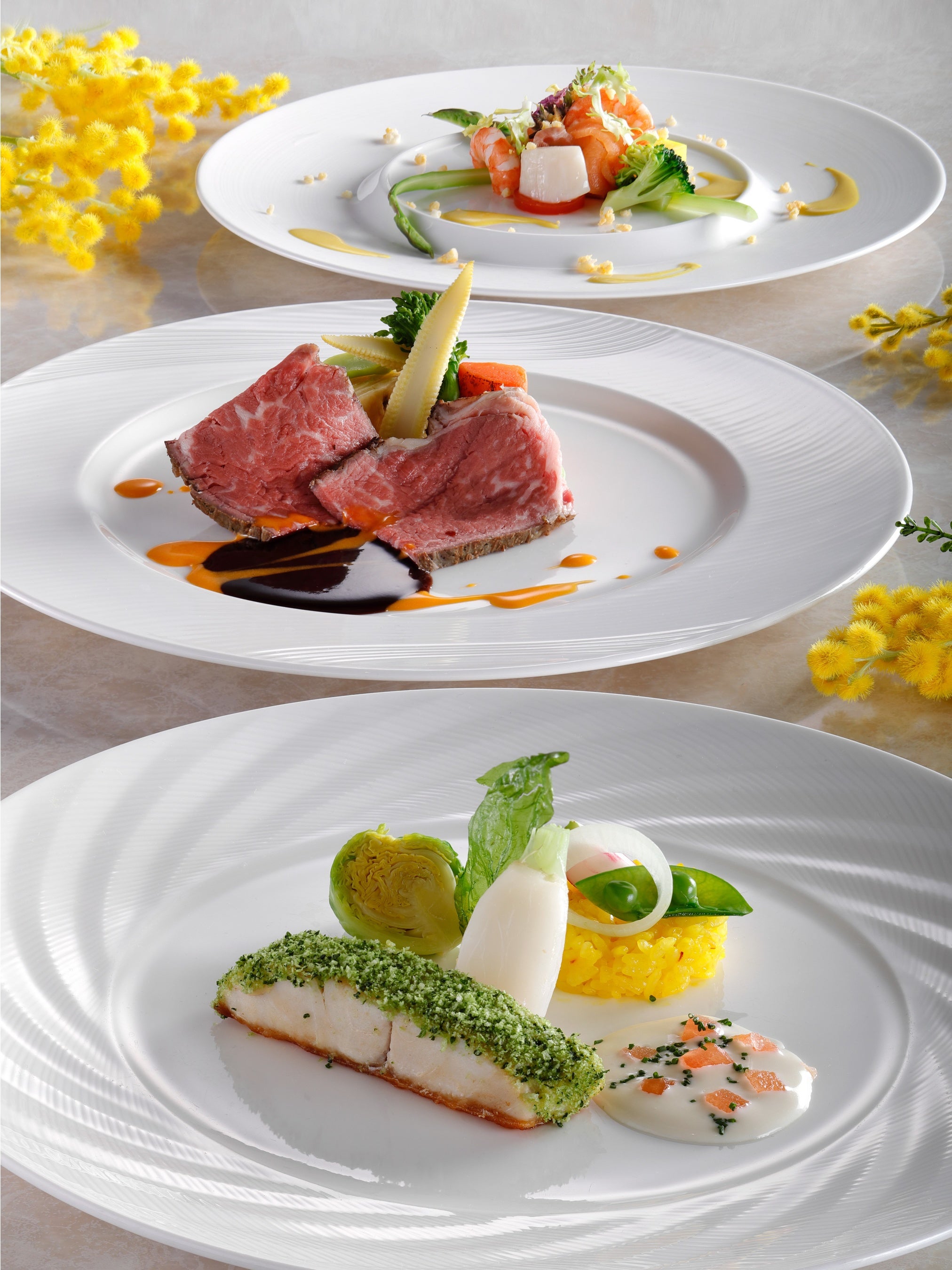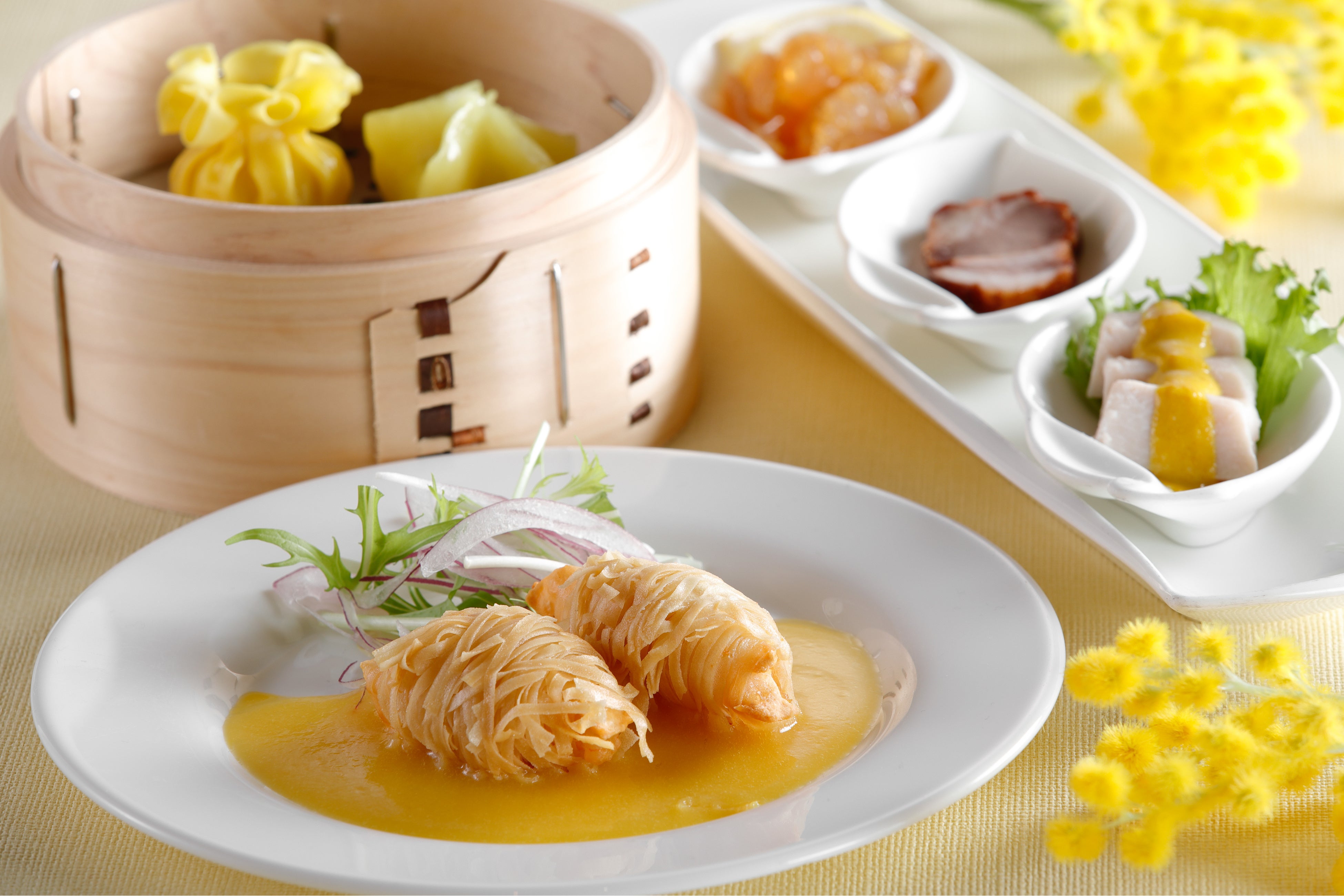冷菜三種盛り合わせ(柚子クラゲ、蒸し鶏 マスタードソース、焼豚) / 蟹肉入り とうもろこしのスープ / 牛肉のオイスターソース炒め / 海老とイカのすり身 春巻き揚げ / 点心二種盛り合わせ / ミモザ仕立てのサラダ / 枸杞の実入り 中国粥 / デザート二種