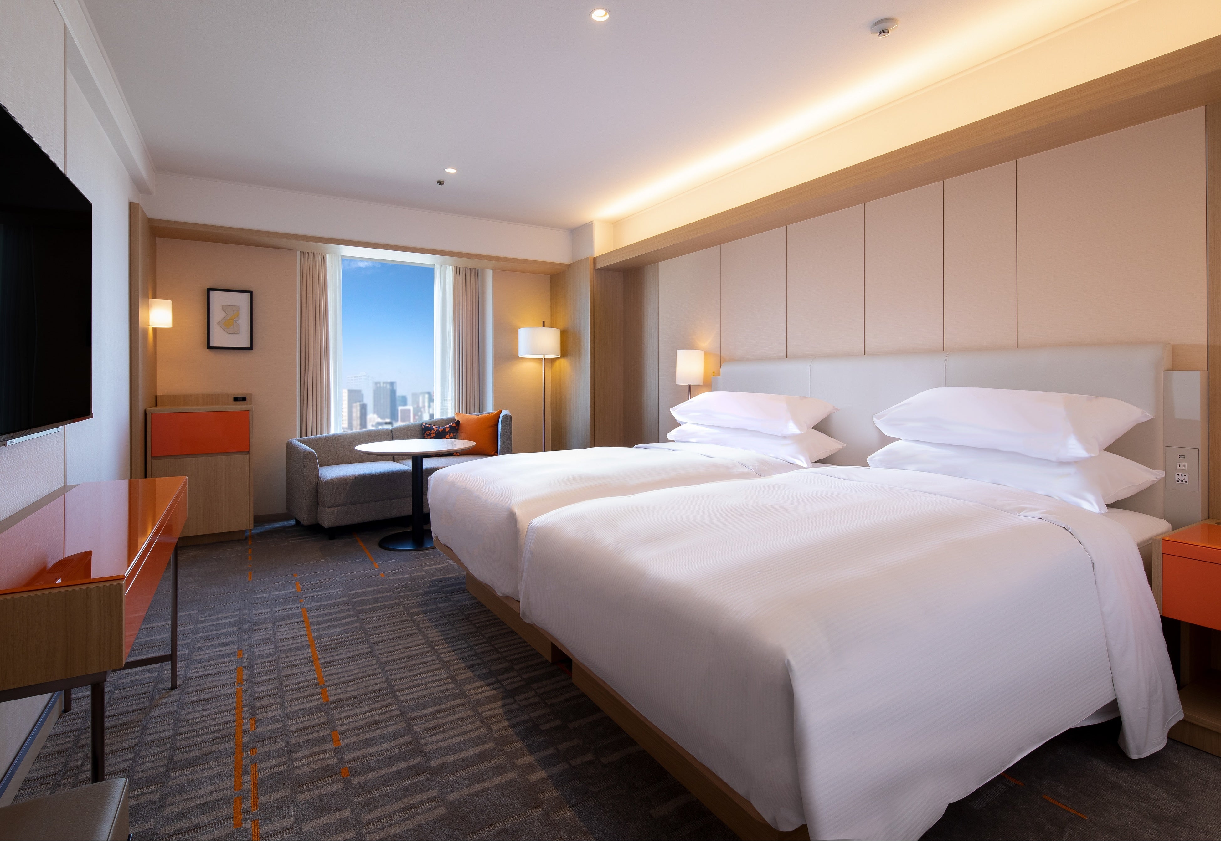 ハッピーイエローの彩りを盛り込んだレストラン&ラウンジ eu(ゆう)のミモザランチ付き宿泊プランをご用意しました。お部屋は明るいオレンジカラーを随所にあしらった、プレミアムフロアのデラックスツインをご用意します。