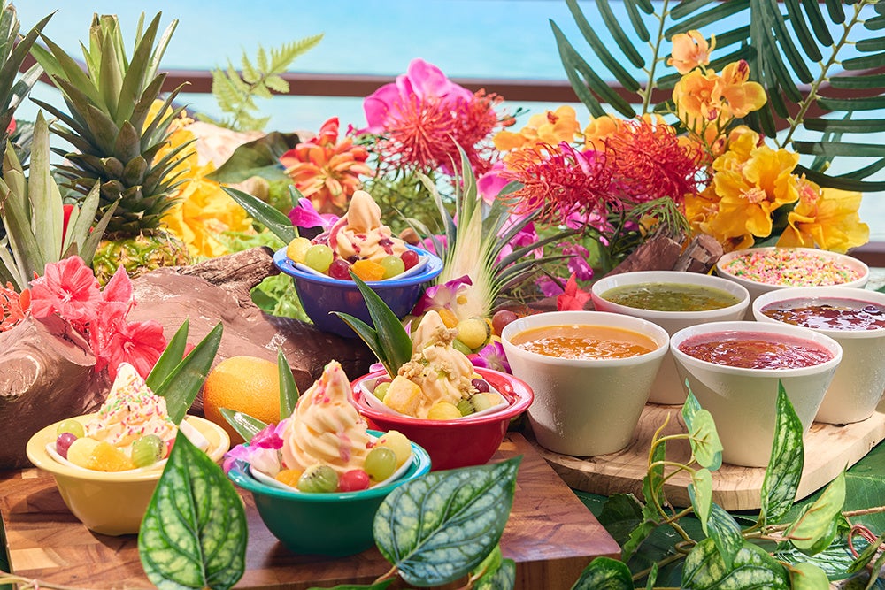 ハワイアンブッフェコーナーのデザートにソフトクリームファクトリーが登場。自分でソフトクリームを絞ってストロベリーやチョコレートのソース、フルーツなどを好きなだけトッピングして楽しもう!