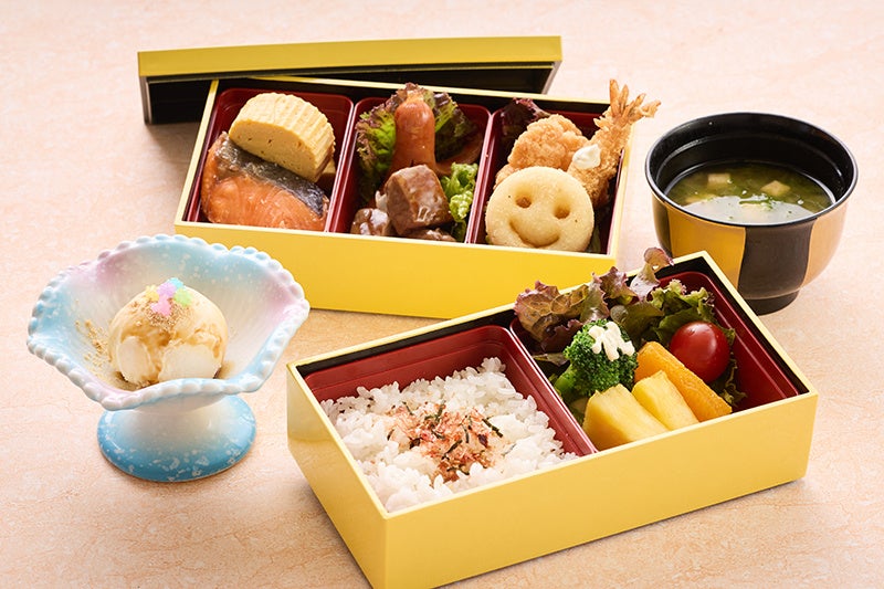 玉子焼きや焼き魚、海老フライ、鶏の唐揚げなど美味しさがいっぱい詰まった玉手箱。デザートは、きらきら金平糖の宝石がのったアイスクリームです。