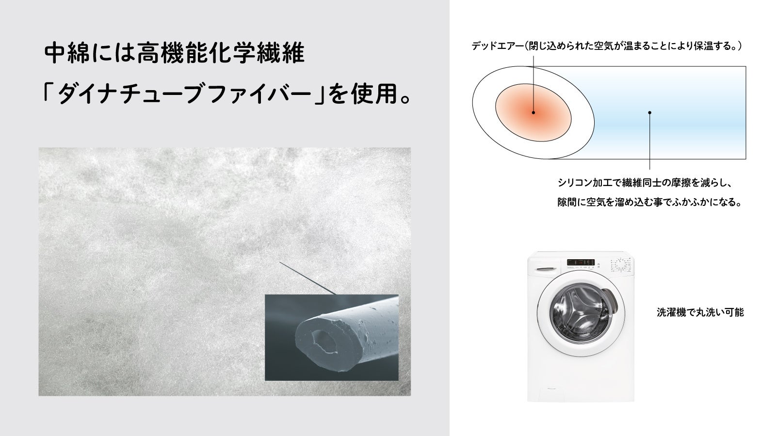 中綿には高機能化学繊維の「ダイナチューブファイバー」を採用。ポリエステル繊維をマカロニのような中空にすることで繊維の中に空気を蓄え、軽量ながら高い保温性を実現。さらに、シリコン加工で繊維同士の摩擦を減らすことで、繊維同士の隙間にも空気を溜め込み、ふかふかの中綿に。大型洗濯機で丸洗いできるため、お手入れもラクラク。
