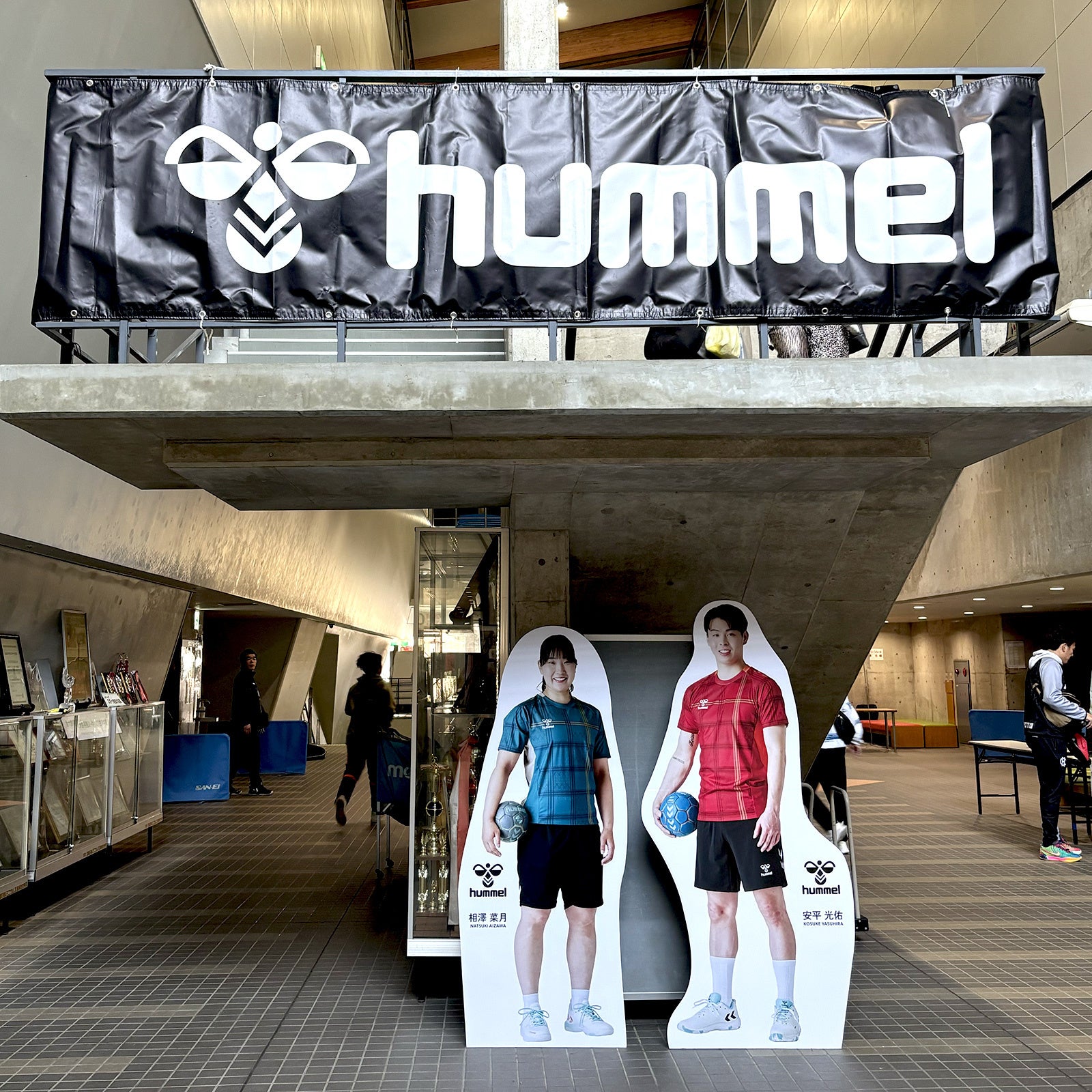 さらに今年は、春中ハンド優勝経験のある安平光佑選手と相澤菜月選手の等身大パネルを設置、ヒュンメル契約選手の部井久アダム勇樹選手とグレイクレアフランシス選手を含めた4名に学生時代に意識していたことなどをインタビュー。ハンドボールを頑張る学生たちへエールを送った。